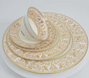 *Free Global Shipping* Made in England. Produced 1961-1986. Provenance: Procured from a Grosse Pointe, MI and Washington, DC collection. Elevate your dining experience with this exquisite Wedgwood Florentine Gold 60-Piece Dinnerware Set, offering service for eight. The Florentine Gold pattern, renowned for its intricate gold scrollwork and mythical dragon motifs, adds a touch of timeless elegance to any table setting....