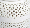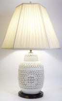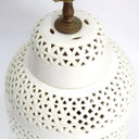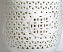 These rare vintage Seyei Japan Blanc de Chine porcelain table lamps were crafted in Nagoya, Japan, and showcase an intricately reticulated (pierced) design, casting a mesmerizing glow through their delicate geometric lattice patterns. Expertly made from fine porcelain, they blend seamlessly with Chinoiserie, Japandi, and Hollywood Regency interiors, embodying mid-century Japanese artistry inspired by centuries-old Chinese Dehua Blanc de Chine...