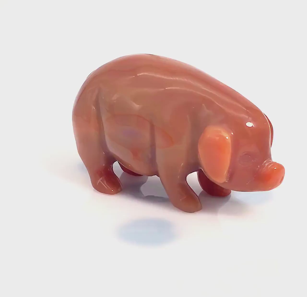Carved from polished carnelian agate, this hand-carved pig figurine is a stunning fusion of natural beauty and expert craftsmanship. The smooth veining and organic stone patterns ensure that no two pieces are alike, while the rounded, lifelike form and delicate facial details showcase the artisan's skill.