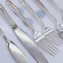 This vintage 88-piece Holmes & Edwards silver plate flatware set in the elegant Danish Princess pattern, first introduced in 1938, features Scandinavian inspired floral motifs with delicate beaded detailing on the handles, making it a timeless and meaningful gift for weddings, anniversaries, or couples starting a new home. Grab it before it's gone. Set Includes: 12 (Twelve) Dinner Forks -...