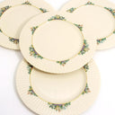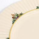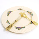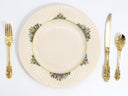 - Four (4) Dinner Plates - Ivory Bone China with 24-Karat Gold Accents - Diameter: 10 7/8" (27.62 cm) - Securely packaged and shipped globally, with added insurance for peace of mind. Made by Lenox, this elegant Rutledge pattern (by Lenox USA) showcases vibrant floral bouquets with rich green leaves, gracefully arranged around the rim. A beautifully sculpted, fluted border...