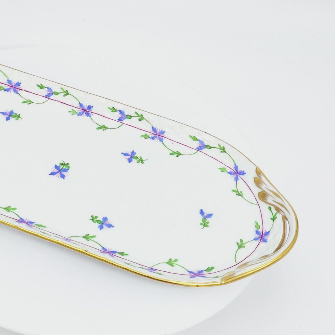 Herend's Blue Garland pattern represents one of the manufactory's most delicate and graceful designs—featuring hand-painted cornflower blue blossoms trailing along pink vines with emerald green leaves in a naturalistic botanical arrangement. This rectangular tray showcases the pattern's versatility beyond traditional dinnerware, with sculptural gilt wheat sheaf handles at each end that demonstrate Herend's mastery of dimensional porcelain work. The piece...