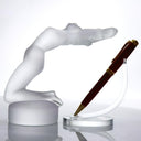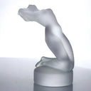 The extraordinary detailing showcases Lalique's signature frosted crystal technique, where molded surfaces are refined through acid-etching and sandblasting to create the luminous finish that made these automotive accessories so prized. The kneeling female form with flowing hair swept by an imaginary wind demonstrates the artistic vision that elevated car mascots from mere ornamentation to collectible art. This dual-purpose piece provides excellent paperweight function while serving as a conversation-starting sculpture that bridges automotive heritage with luxury home decor.