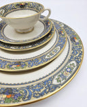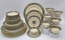 The Autumn Gold pattern features a delicate arrangement of pears, grapes, and autumn florals rendered in soft earth tones, with hand-applied raised enamel dots creating dimensional interest along the border. The dimensional enamel technique adds subtle texture that catches light beautifully during candlelit dinners, while the 24k gold rim provides formal polish without overwhelming the design. The footed teacups feature an elegant pedestal base that elevates the cup off the saucer, creating visual interest and making them ideal for formal tea service or after-dinner coffee. This complete service for eight includes all essential place setting components, making it ideal for formal entertaining or as a foundational set for collectors building comprehensive china services.
