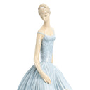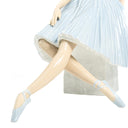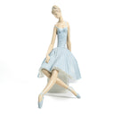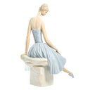 The seated ballerina gazes downward in a moment of quiet anticipation before taking the stage, her soft blue tutu featuring an intricately pleated skirt and scroll-patterned bodice. The warm flesh tones of her elongated limbs contrast beautifully with the cool blue of her costume and pale grey stone seat, creating visual harmony characteristic of Lladró's masterful color palette. At over 14 inches in both height and width, this is among the larger ballerina figurines in the Lladró catalog—a commanding presence that rewards close examination.