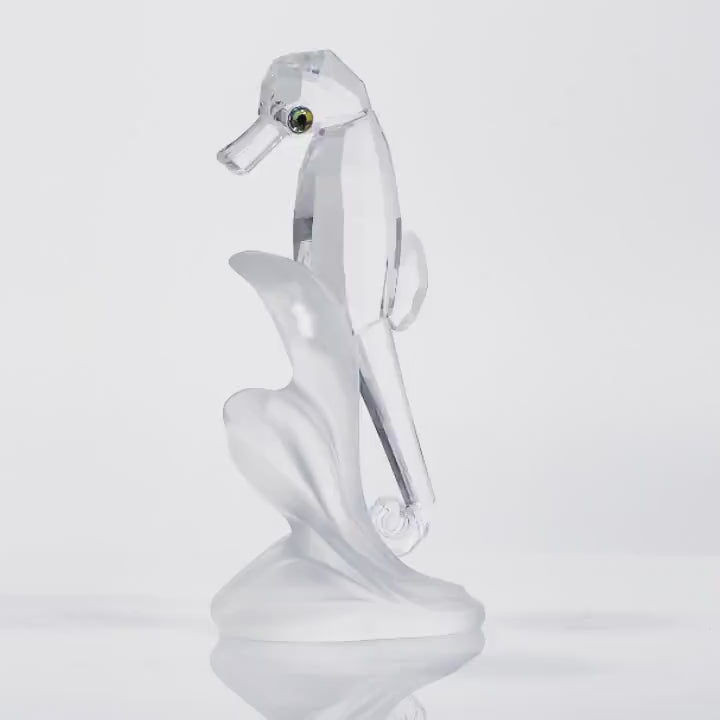 Meet the elegant Seahorse, a captivating Swarovski crystal piece that embodies the grace and mystery of ocean life. Expertly crafted from clear faceted Austrian crystal, this stunning figurine features vibrant green crystal eyes and sits gracefully on a frosted crystal base, creating a beautiful contrast that captures light from every...