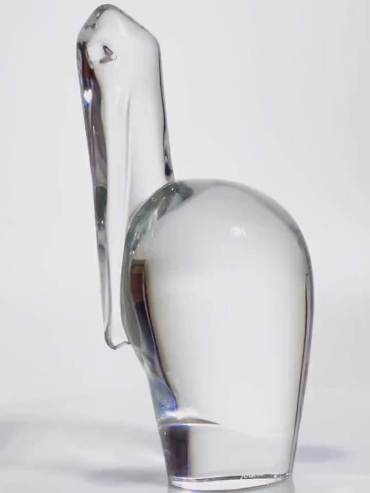 Height: 6 1/2" (16.5cm) Width: 2 1/4" (5.7cm) Depth: 3 1/4" (8.3cm) This elegant Baccarat crystal pelican paperweight combines sophisticated sculptural artistry with premium desk functionality, showcasing the French luxury crystal excellence that distinguished the 1970s-1990s era. The streamlined pelican form captures graceful essence through clean geometric lines and polished...